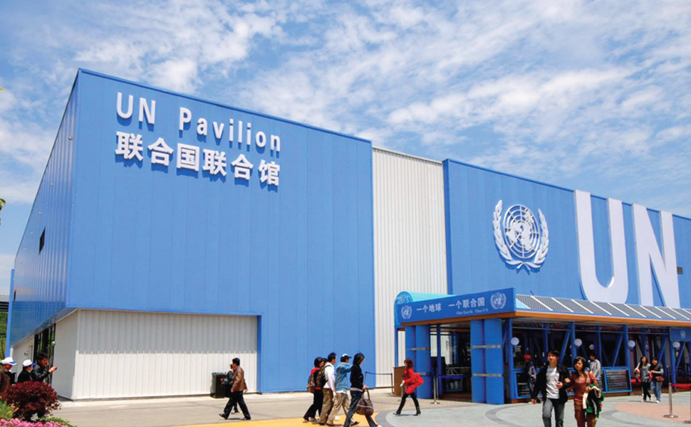 世博会联合国联合馆集中展示联国及其系统机构的各组织在可持续发展、气候变化、城市管理等领域进行的有益尝试和成功实践。 展馆外观简洁,以蓝色为主色调,配以醒目的联合国会