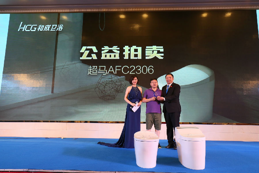 随着气氛的愈加热烈,迎来了晚宴的高潮部分——特别版超马公益拍卖活动,两台分别付着HCG品牌代言人林志玲和HCG董事长亲笔签名的马桶,引起了大家的浓厚兴趣。将用心爱贯彻到底,最后拍卖所得善款捐献给苏州吴中区台协爱心基金委员会。