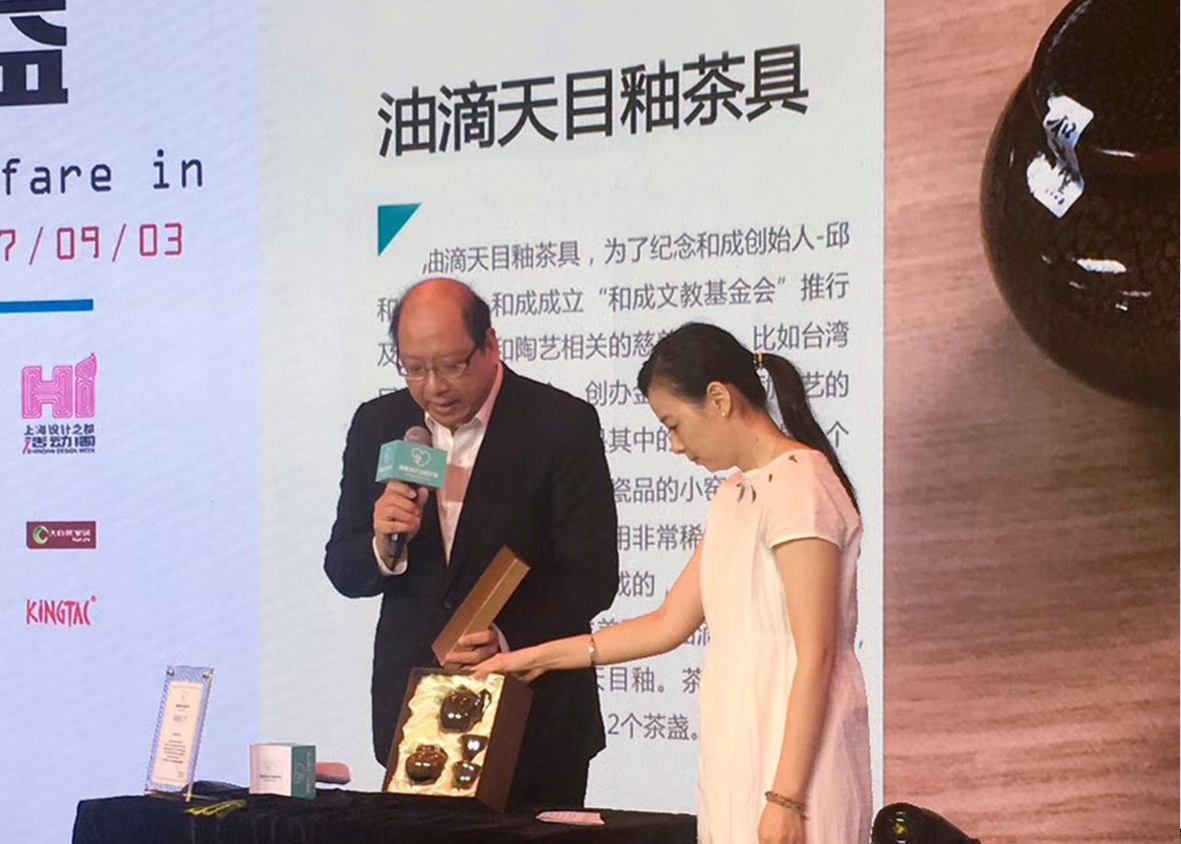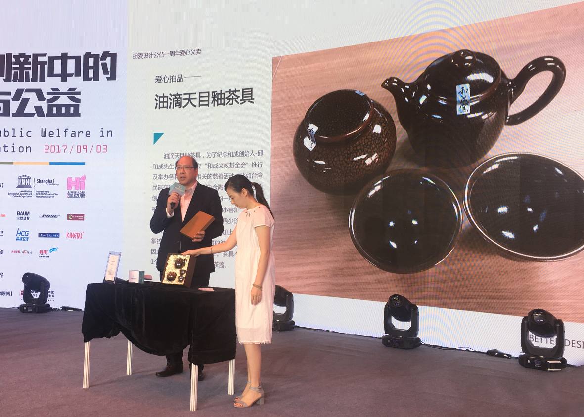 活动最后义卖环节由SMG知名主持人周瑾担任爱心拍卖官,沪上知名主持人夏磊、刘烨站台支持。HCG和成卫浴捐赠的工艺品“油滴天目釉茶具”,被现场爱心人士以人民币3000元的价格拍得,所得善款将会参加“让爱翻倍”的腾讯九九公益日,最后善款将用于九天洞苗圃希望小学改造项目。