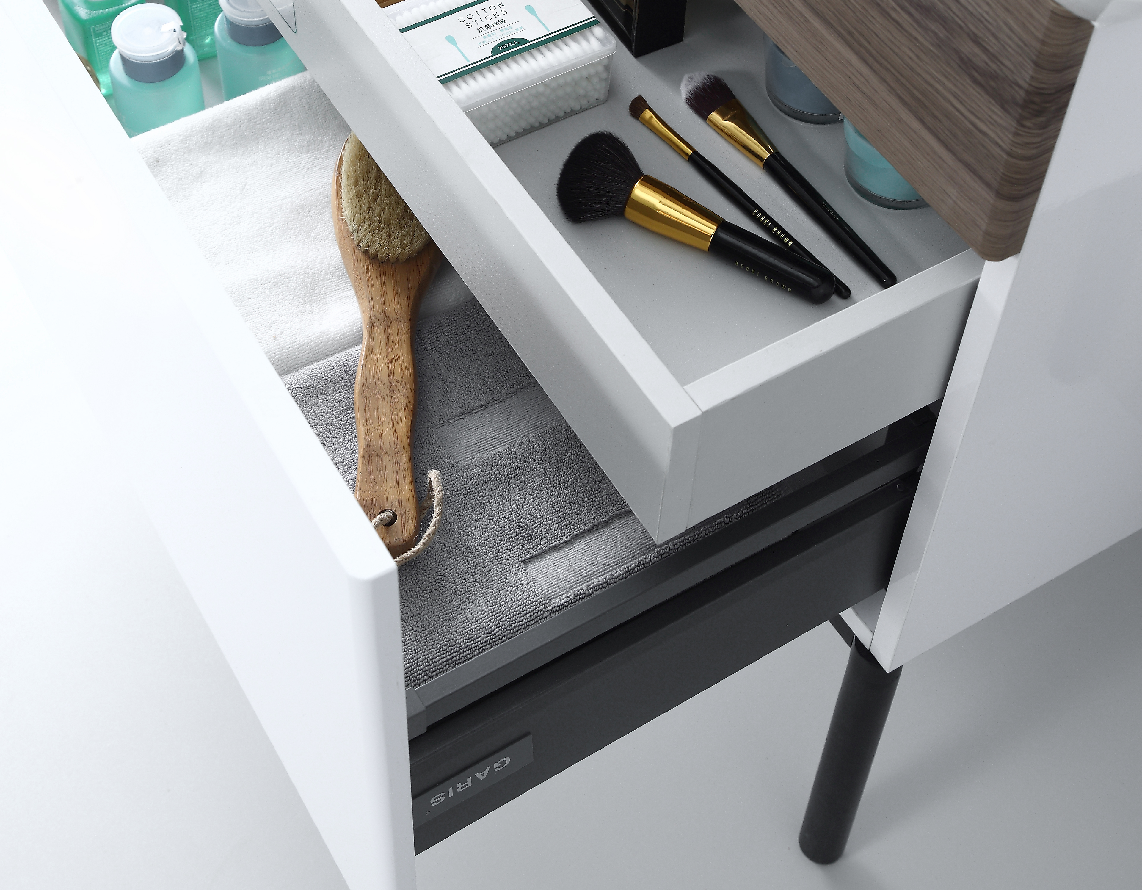 主柜采用子母抽设计,主抽采用皮革拉手。