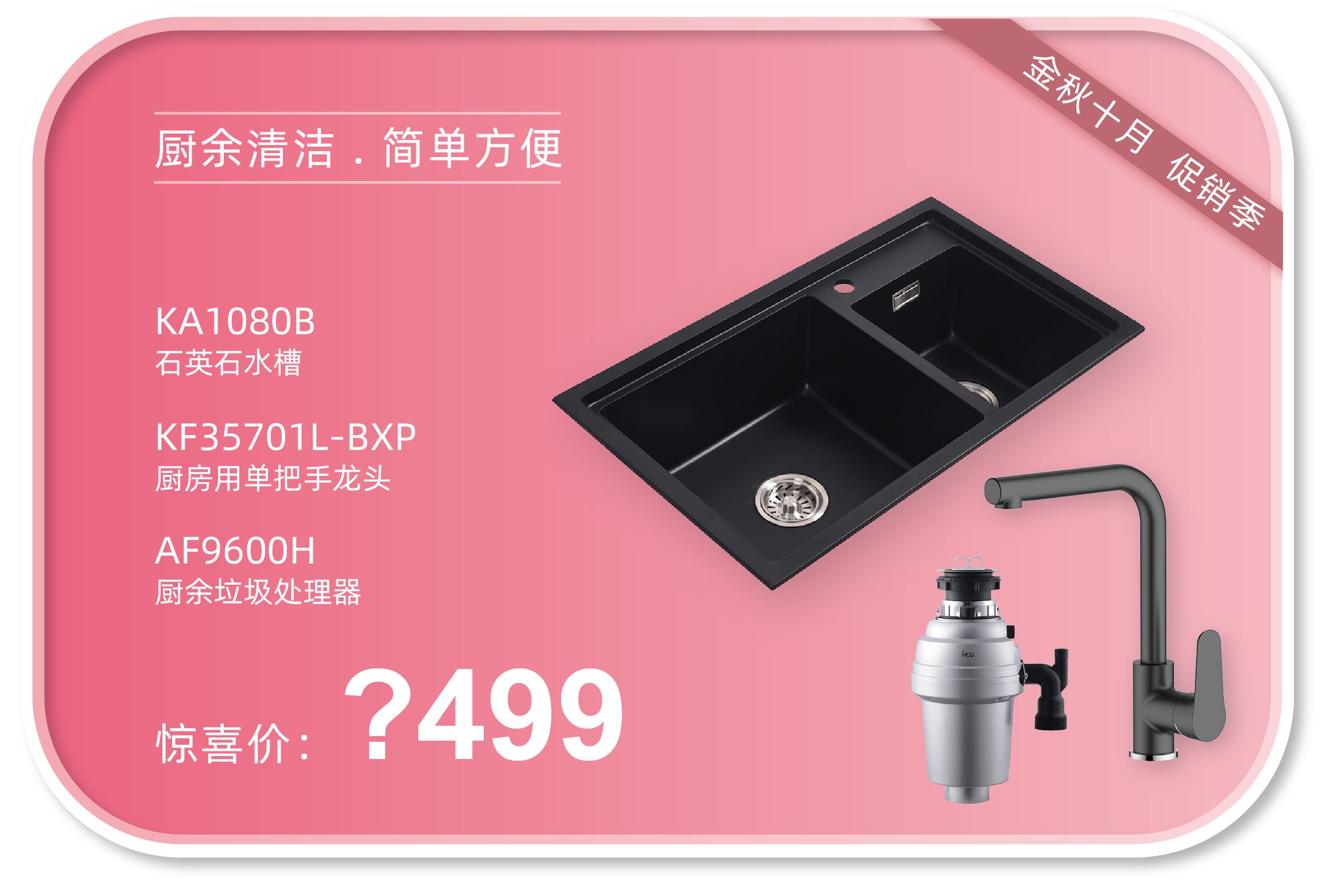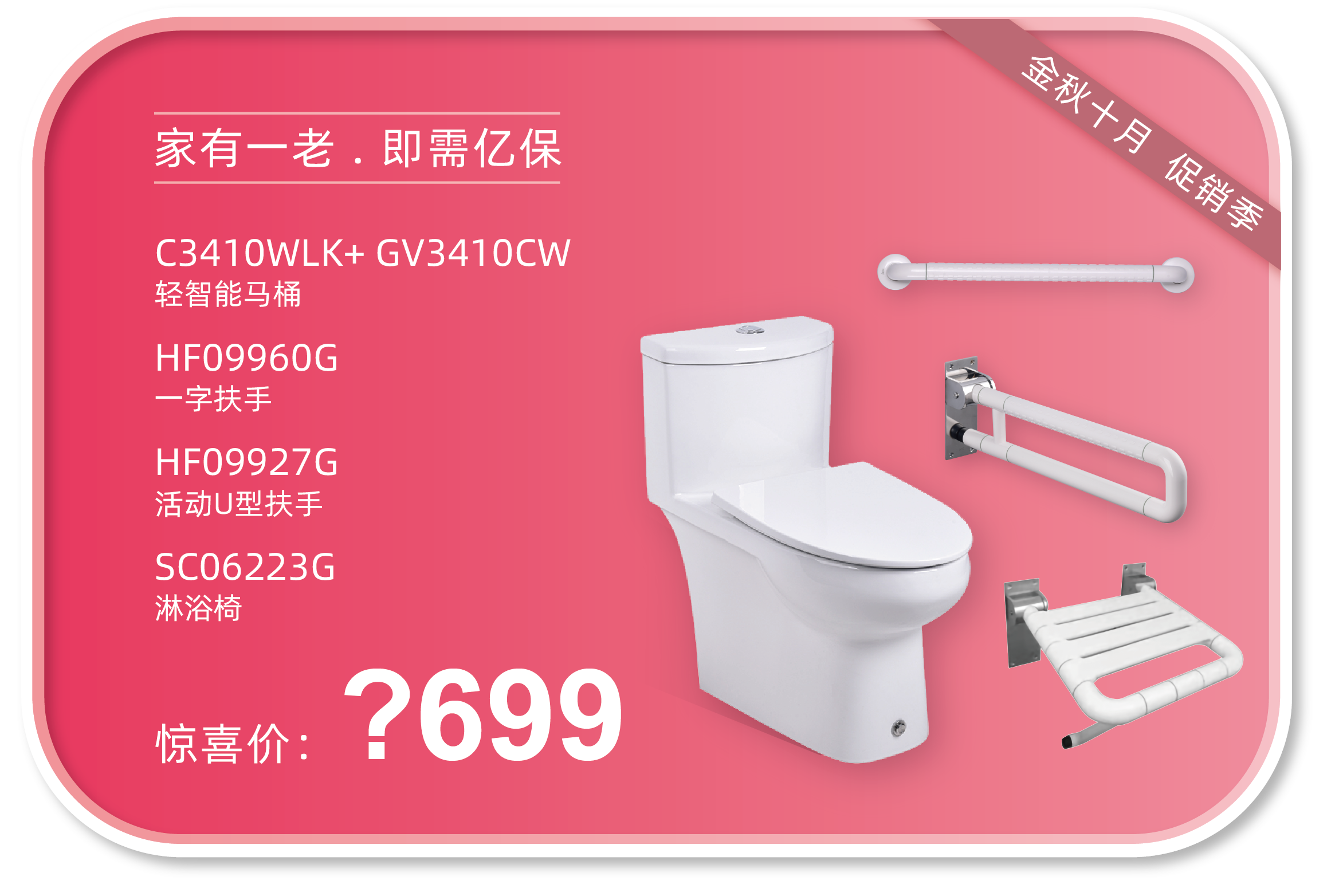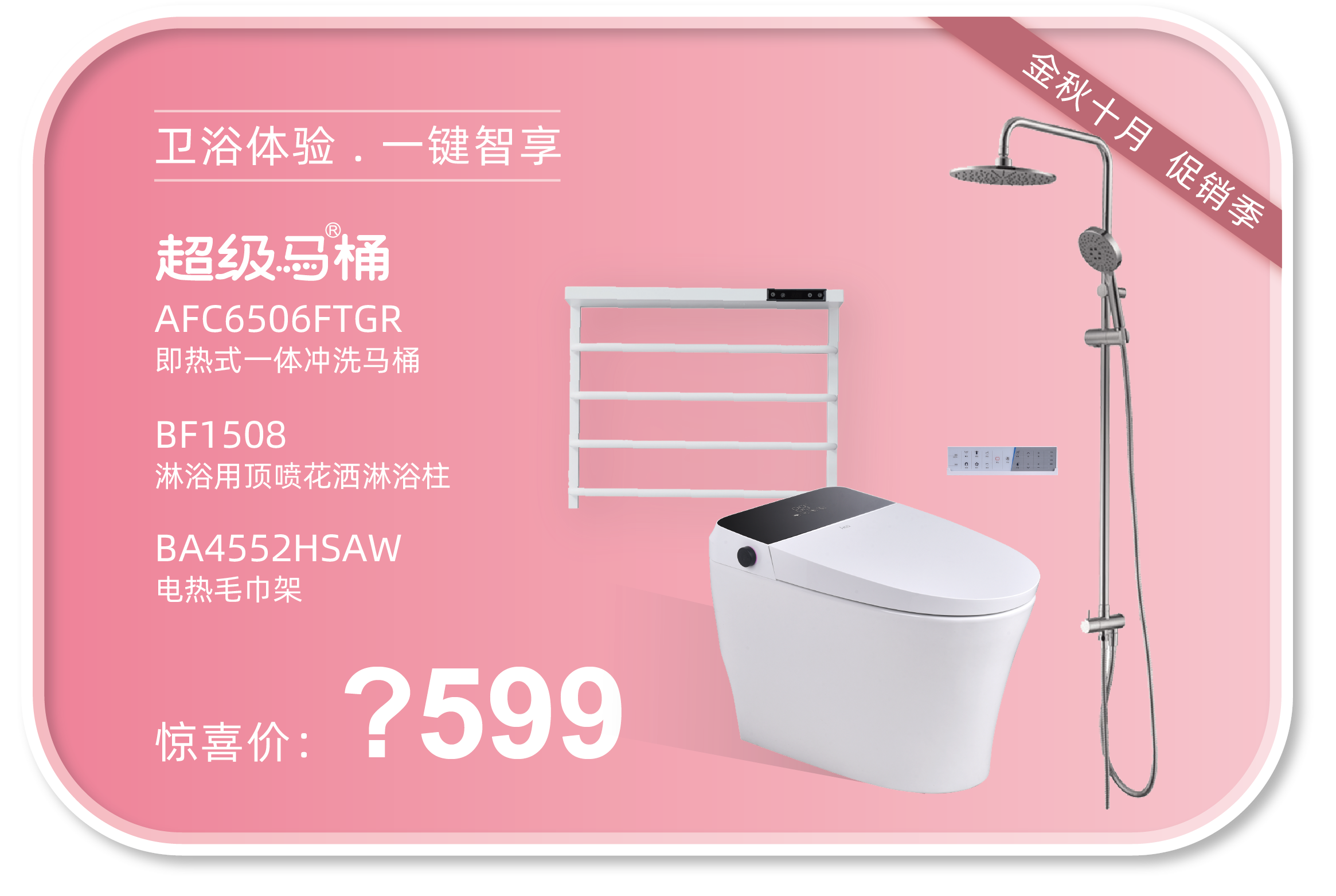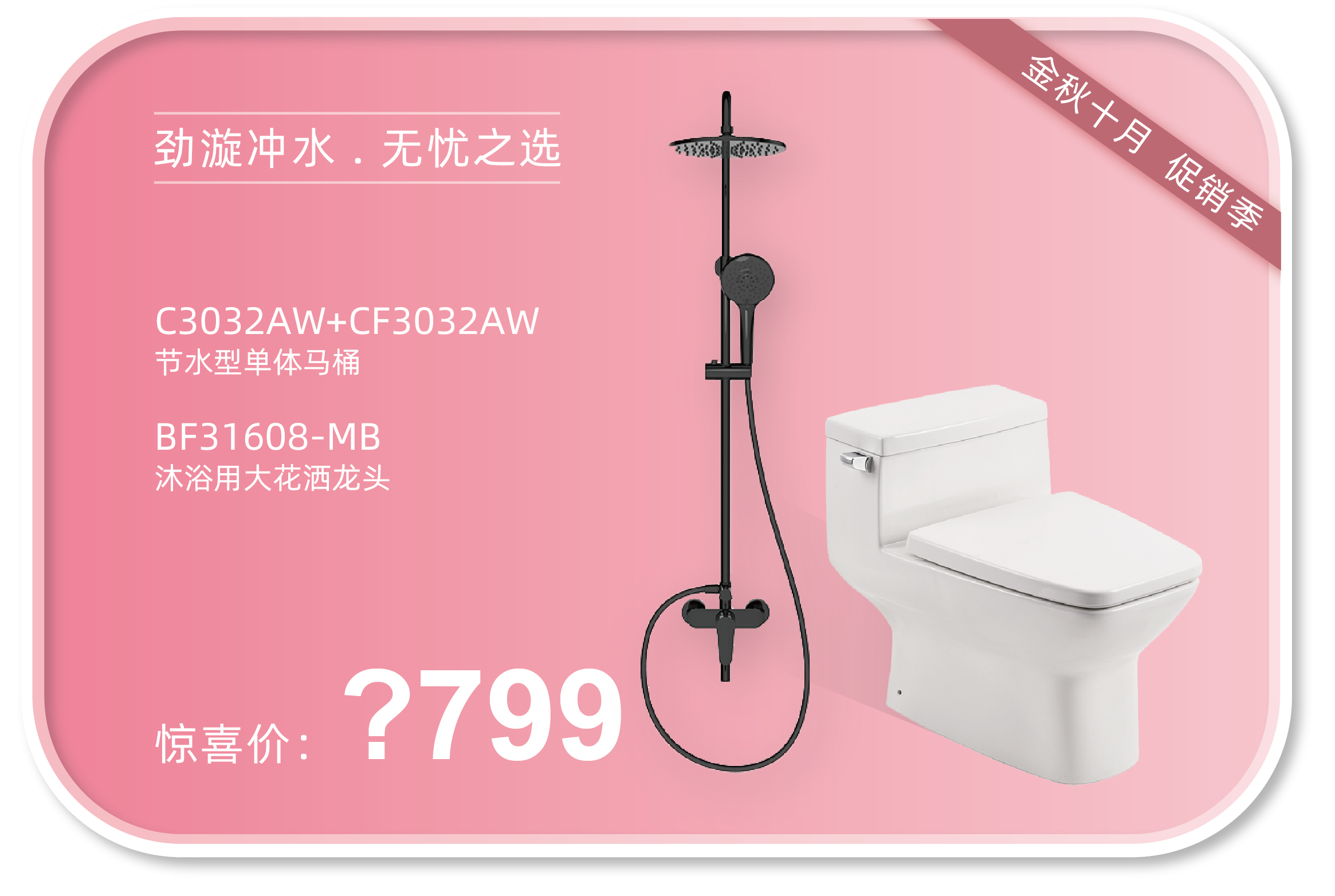 参与方式:活动期间在任一门店购买系列套餐,上传(销售凭证)+(付款凭证)至HCG和成卫浴官方微信平台,即可以1元购买“HCG增压手持花洒”一个,限量50个