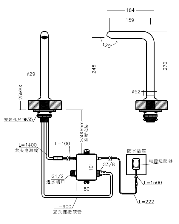配件: 龙头主体(台下控制盒、进水软管、角阀、面盆落水需另购)