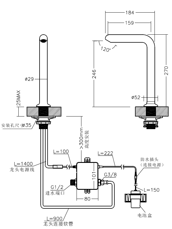 配件: 龙头主体(台下控制盒、进水软管、角阀、面盆落水需另购)