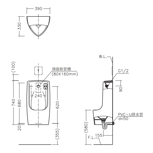 ● 节水型小便斗 ● 后进水 ● 造型现代时尚 ● 中型尺寸 ● 陶瓷洒水器,永不锈蚀