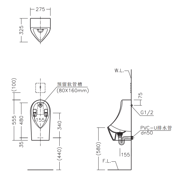 ● 后进水 ● 节水型小便斗 ● 造型简洁,现代感强 ● 小型尺寸,适用于紧凑型公共空间 ● 陶瓷洒水器,永不锈蚀
