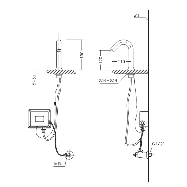 ● 全铜本体 ● 红外线水嘴感应。 ● 气泡出水,每分钟出水量为3L,属于节水型龙头,一级水效。 ● 连续出水60秒自动关闭,以防误感应到盆内杂物。 ● 感应距离出厂设置为20CM,可通过主板按键调节长短。 ● 额定电压:DC6V (4节1.5V 5号碱性干电池) ● 适用水压范围:0.05MPa~0.6MPa