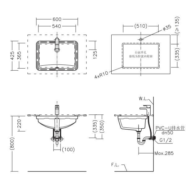 方形设计,造型简约大气,尺寸大小适中 隐藏式溢水孔设计,外观简洁美观 台下式洗脸盆,便于清洁