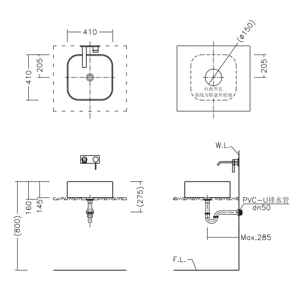 方形薄边造型设计,简洁大方 可搭配高脚龙头或墙出水龙头