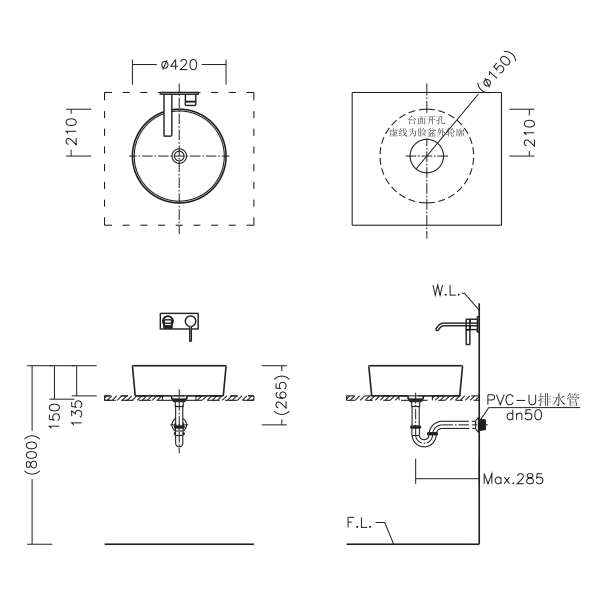 圆形薄边造型设计,简洁大方 可搭配高脚龙头或墙出水龙头