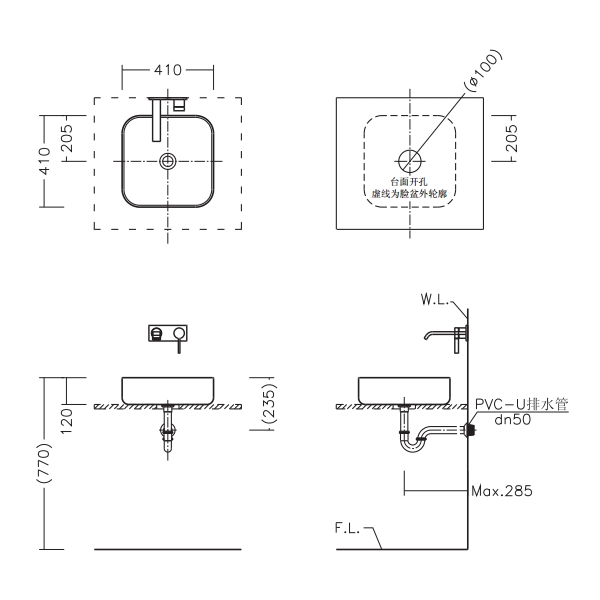 方形薄边造型设计,简洁大方 可搭配高脚龙头或墙出水龙头