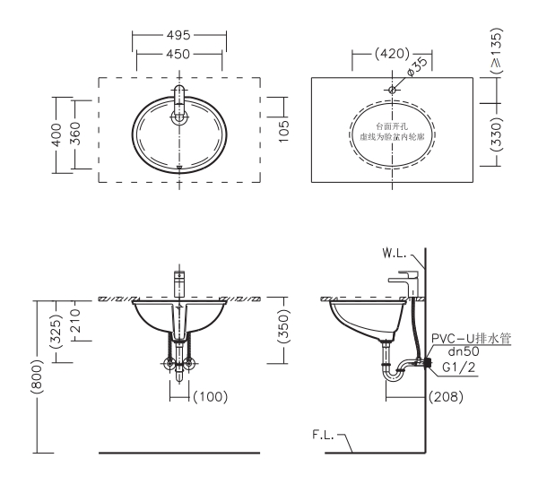 ● 椭圆形 ● 隐藏式溢水孔 ● 台下式洗脸盆,便于清洁