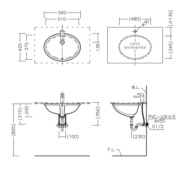 ● 椭圆形 ● 隐藏式溢水孔 ● 台下式洗脸盆,便于清洁