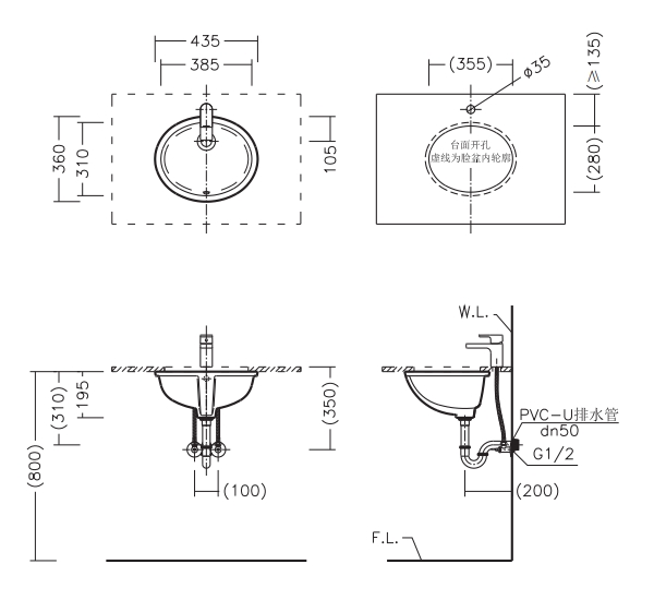 ● 椭圆形,小尺寸 ● 隐藏式溢水孔 ● 台下式洗脸盆,便于清洁