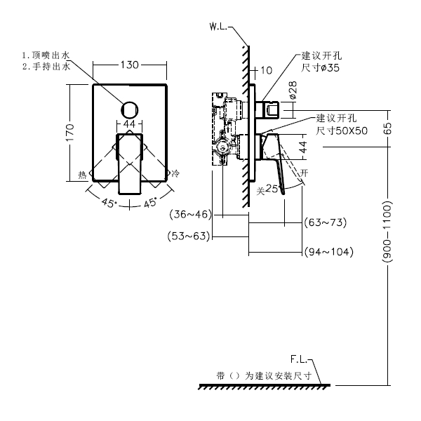 ● 暗装大淋浴,可搭配不同款的顶洒及手持,满足不同的装修风格;