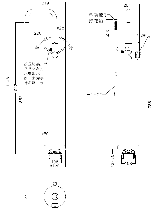 ● 按压式切换阀,一键切换龙头/花洒出水,按压手持出水,提拉浴缸龙头出水,关闭水源自动回位,人性化考量