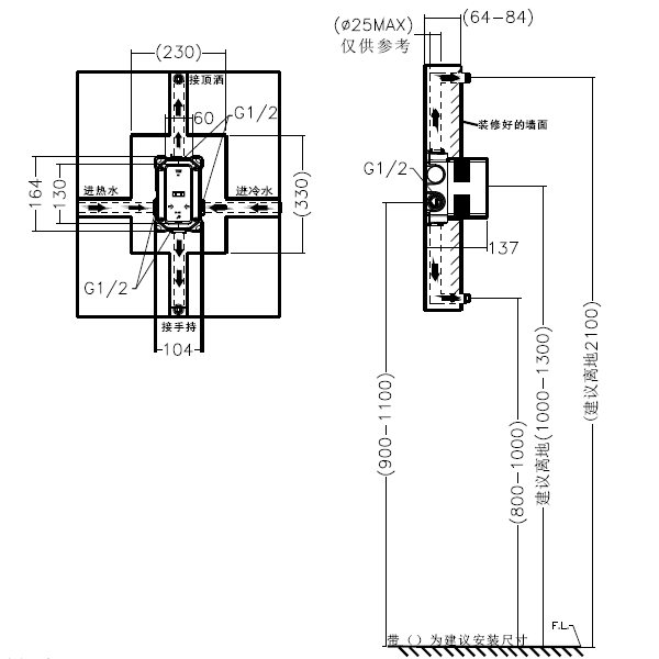 ● 优质黄铜:阀体采用优质铜材质,确保用水安全健康 ● 优质阀芯:选用进口卡洛斯阀芯,长久耐用 ● 辨识考量:阀体冷水端配蓝色橡胶圈,热水端配红色橡胶圈,顶洒和手持花洒出水端配黑色橡胶圈,不同颜色提供辨识度,方便安装,避免误操作引起其他不必要的麻烦。盒子上盖带水平仪,安装时可快速调整阀体于合适的位置,避免安装后歪斜等与墙面不平行状况 ● ABS盒子:阀体外盒采用ABS材质,紧固耐用,方便拆装;带NBR墙垫,方便暗装阀体拆装维护,保护阀体 ● 二路出水:二路出水设计,手持花洒有2条水路可选择