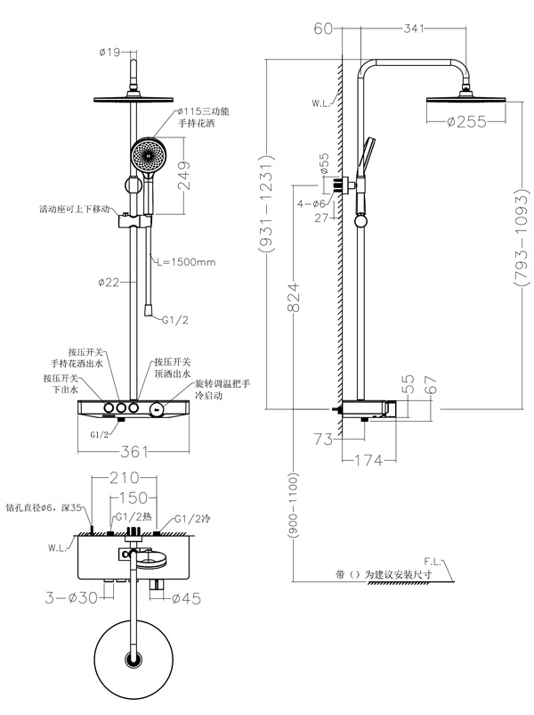 ● 龙头本体采用优质铜材质,抑制细菌生长,耐腐蚀性强, 使用安全无危害 ● 旋转调温,可以根据使用情况自由调节 ● 带下出水嘴 ● 可升降可旋转304不锈钢淋浴柱,调节范围300mm ● 按压式滑座,配三功能手持花洒,花洒出水角度可调 ● 加宽置物平台,光滑美观,满足日常的洗发水沐浴露等置物需求 ● 独立按键式切换,顶洒、手持及下出水可随心切换,洗浴方便 ● 优质表面处理工艺,符合盐雾实验24小时9级标准