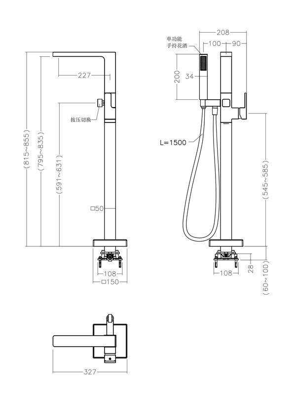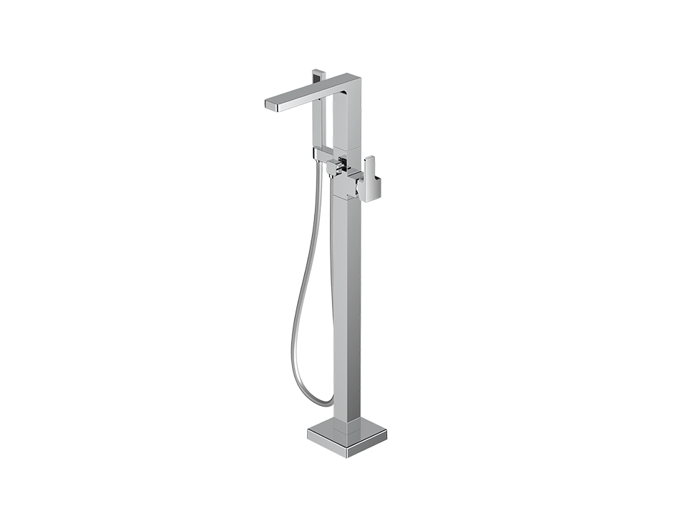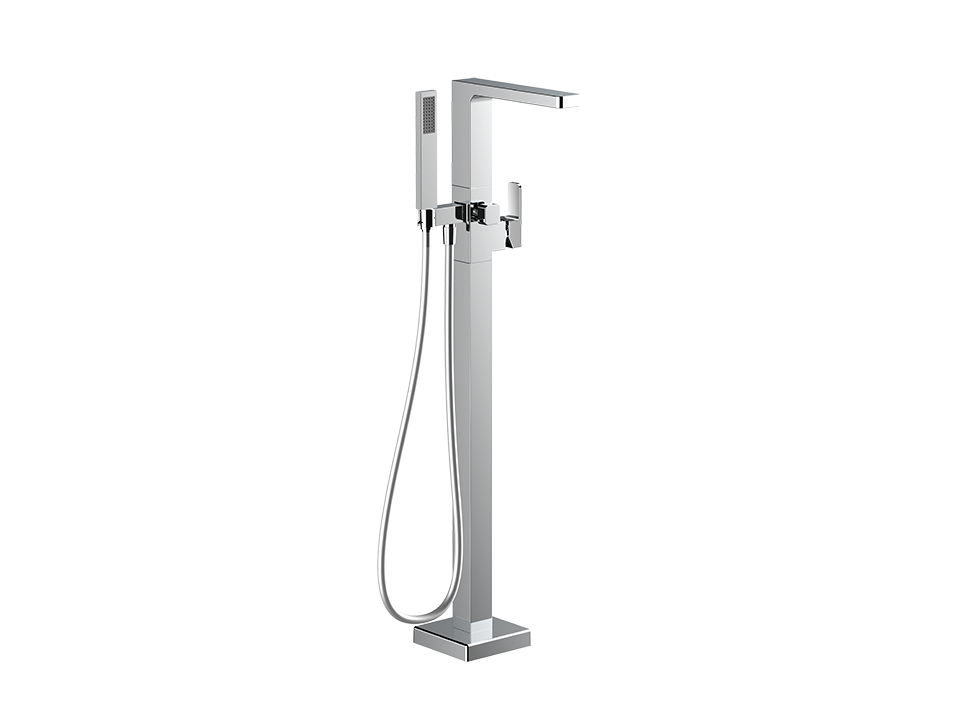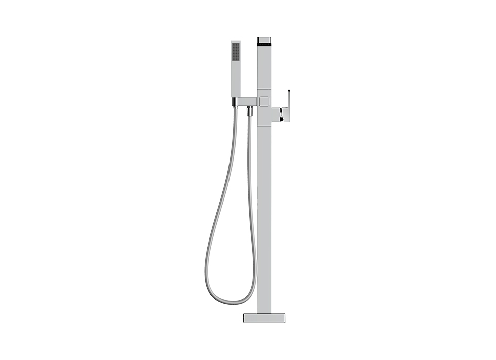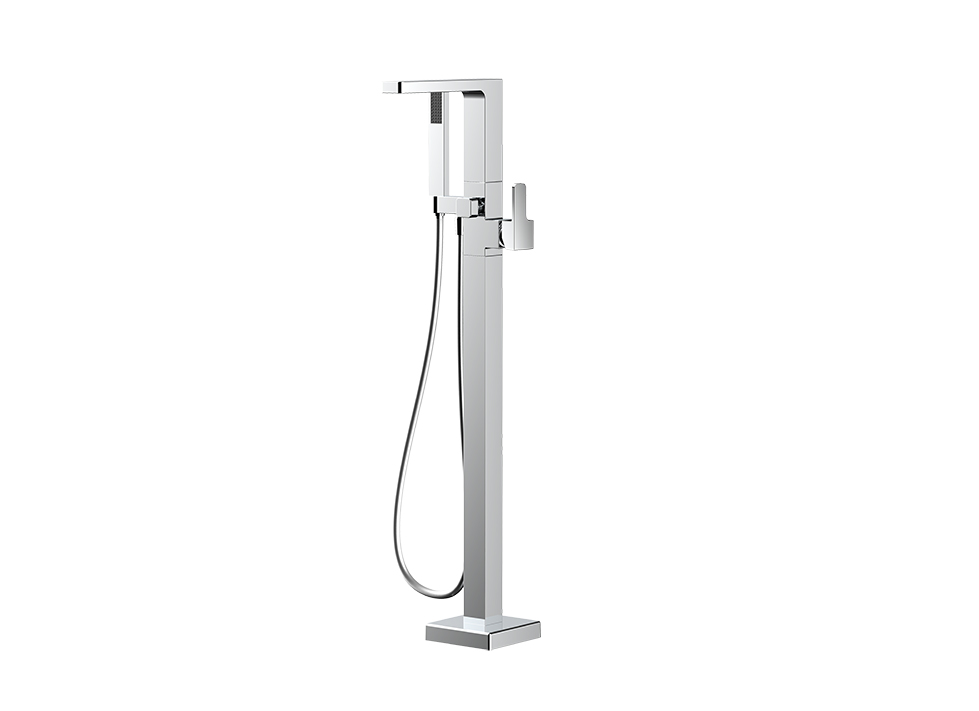 ● 时尚造型:方形落地式设计,精致简约 ● 优质黄铜:采用优质黄铜材质,防腐防锈性能强,坚固耐用 ● 强劲出水花洒:单功能铜材质一字型手持花洒,强劲花洒水, 感受SPA级的沐浴体验(配置PVC银泊管) ● 按键切换出水:两功能按压式自动切换阀,随心切换龙头/花洒出水。 启始龙头出水 - 按压切换为手持花洒出水 - 再提拉龙头出水, 关闭水源后切换阀自动复位至龙头位,人性化设计,更加符合用 户使用习惯 ● 优质镀层:优质表面处理工艺,符合盐雾实验24小时10级标准
