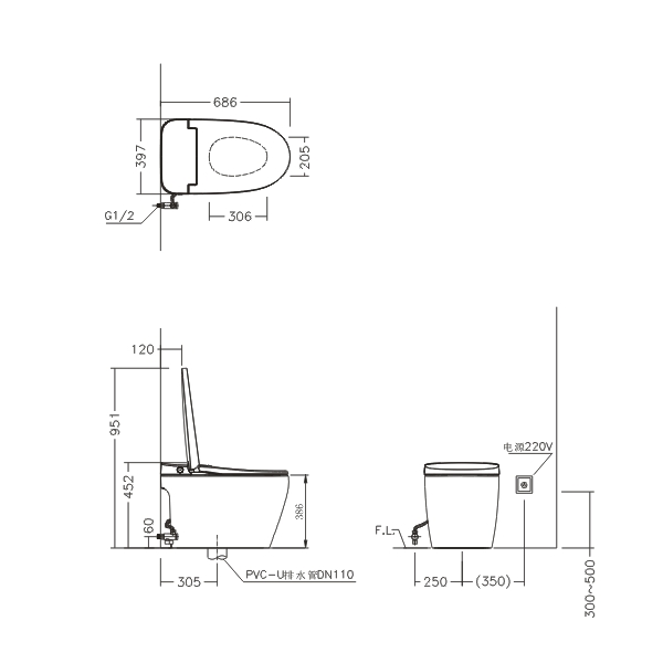 • 三档暖座 • 着座润壁、离座冲水 • 停电冲水、脚触(微波)冲水 • 脉冲阀式喷射虹吸冲水系统 • 产品系列:轻智能超级马桶 • 盖板材质:树脂(PP) • 产品尺寸:686x397x452 mm • 额定电压:AC220V • 额定功率:50W • 电源线长度 : 1.5m • 平均用水量:4.8L(4.2/6L) • 坑距:305mm • 适用水压范围:0.12MPa(动态)~0.75MPa(静态) • 安全保护:着座感应器、温度传感器、温度保险丝、温控器、漏电保护插头 • 操作方式:侧按键、脚触
