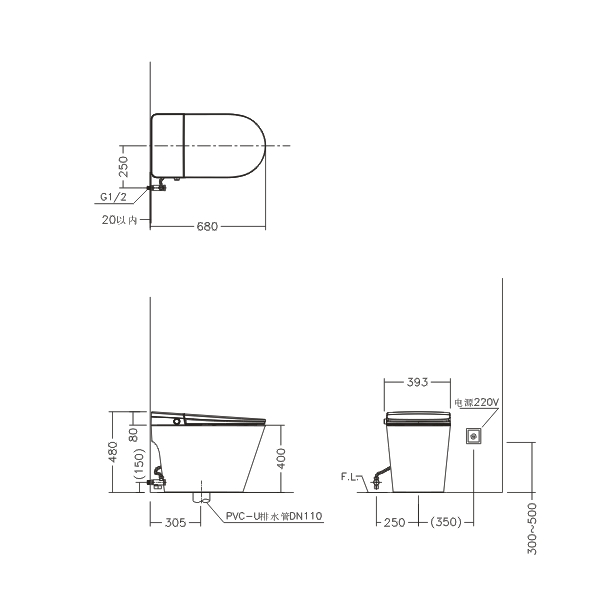 ● 下沉式水箱搭配专用水泵,冲力强劲 ● 具备暖座,离座冲水功能 ● LED柔光夜灯 ● 脚感冲水功能 ● 产品系列:智慧型轻智能马桶 ● 盖板材质:树脂(PP) ● 产品尺寸:680×393x480mm ● 额定电压:AC220V ● 额定功率:100W ● 电源线长度:1.5m ● 用水量:4.0L(水效等级1级) ● 坑距:305mm ● 适用水压范围:0.06MPa~0.75MPa ● 安全保护:热熔断丝、双金属片、过流保险丝 ● 操作方式:侧按、脚触
