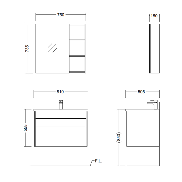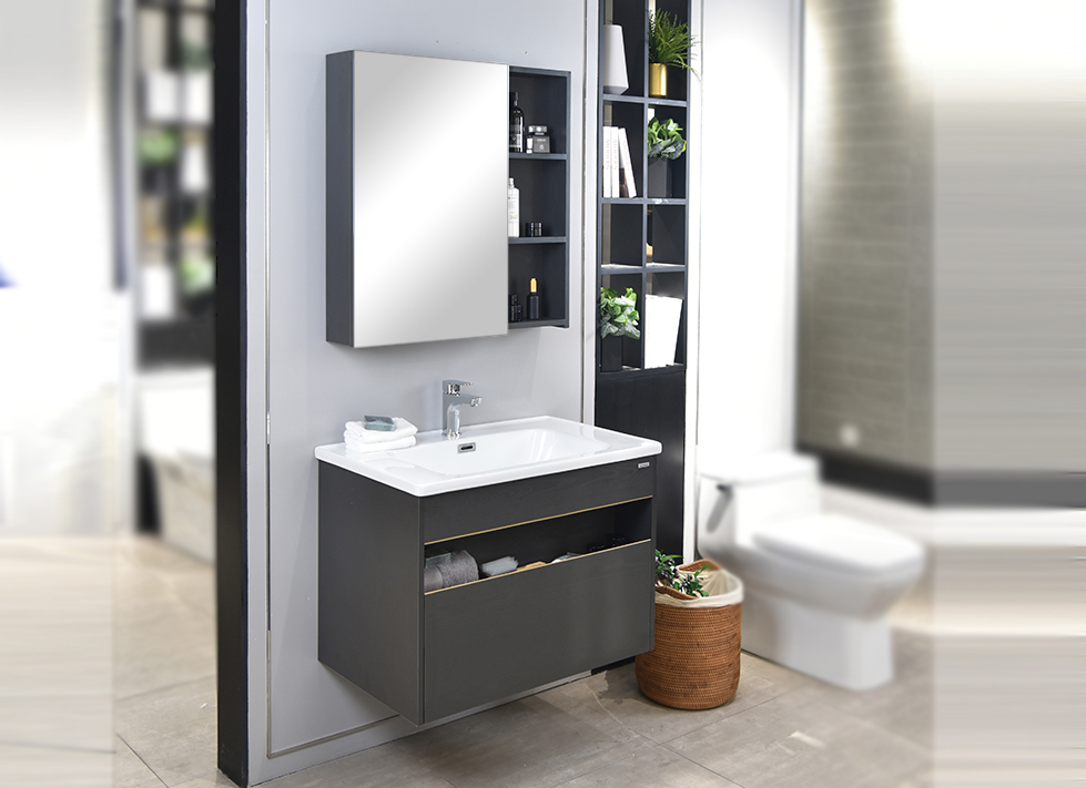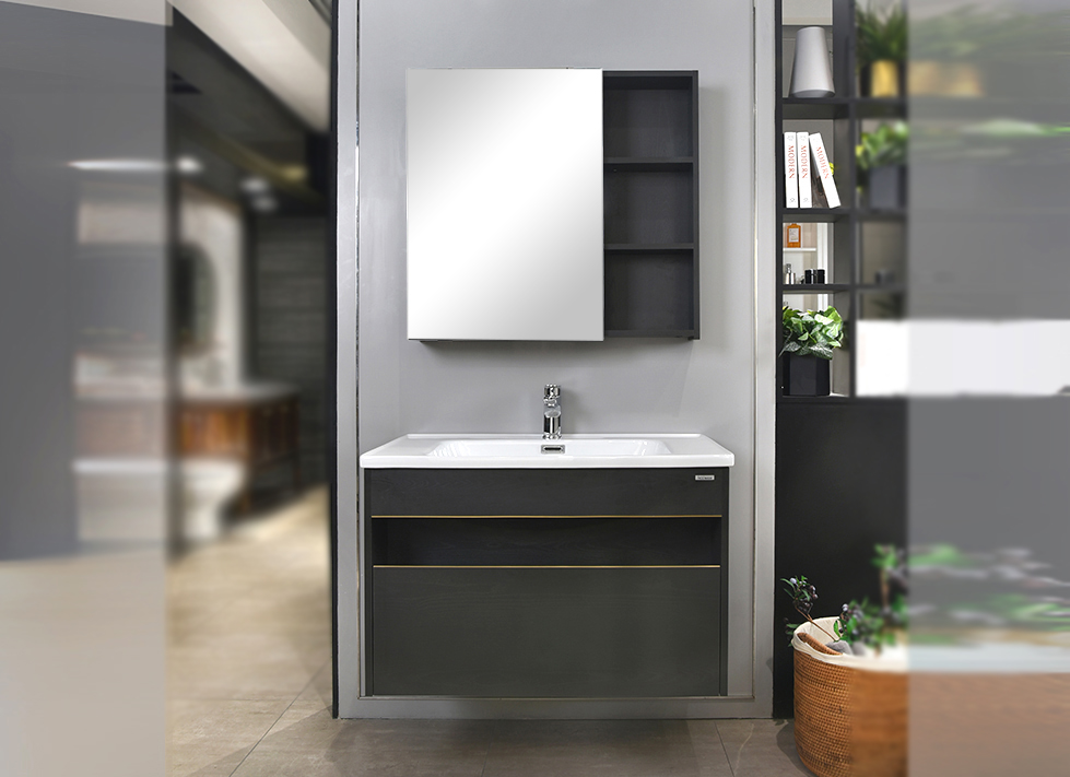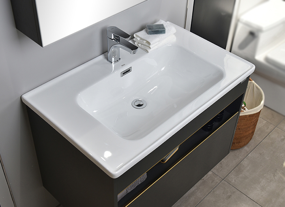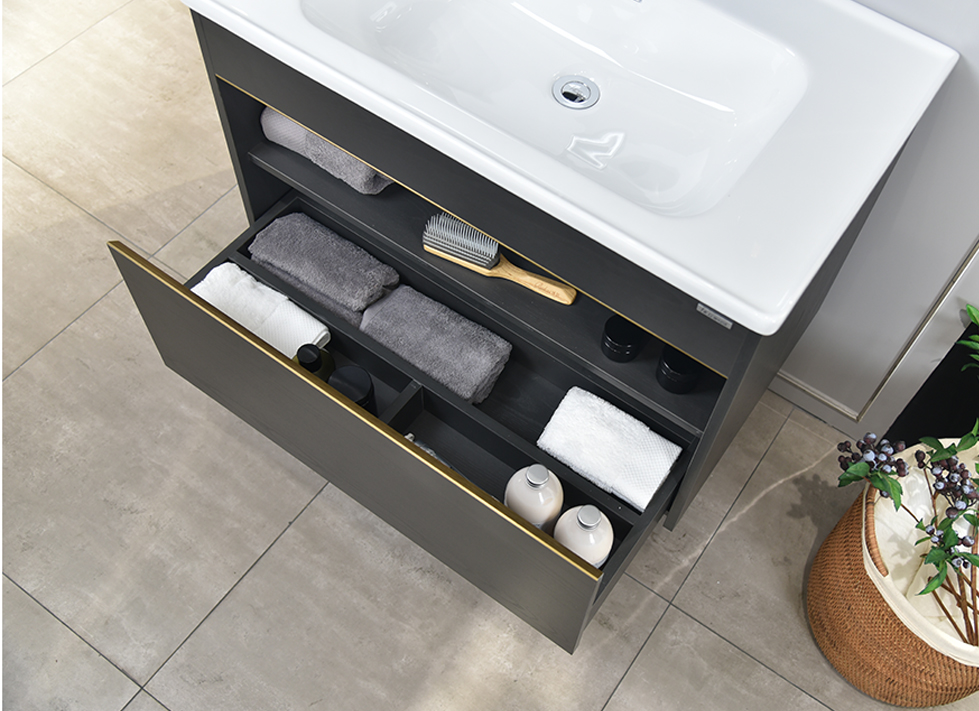 ● 现代轻奢风,深灰基调饰以复古金边,稳重大气 ● 主柜采用环保多层实木为基材,防虫防腐防潮 ● 陶瓷一体盆方便打理且储水量大 ● 隐藏式拉手大抽屉,搭配开放式储物平台 ● 局部开放格镜柜,随手解决卫浴收纳烦恼 ● 优质品牌缓冲导轨,顺滑平稳,经久耐用