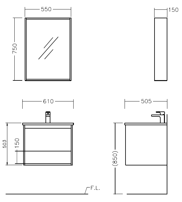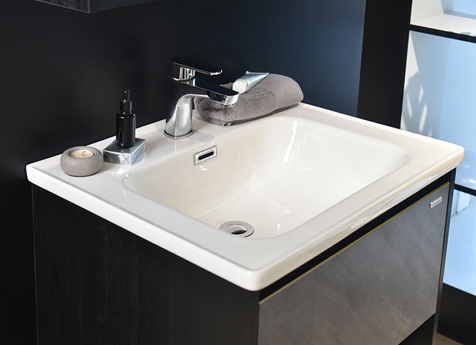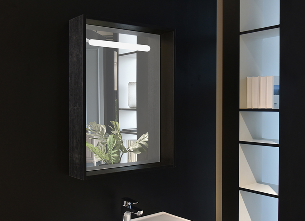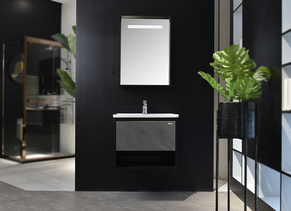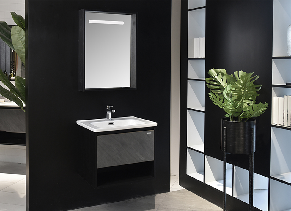 ● 现代简约风格,浴室柜组整体采用多层实木板,表面为三聚氰胺贴面; ● 柜体表面为浅水泥灰色及深灰色,上部为无拉手抽屉,下部为开放式储物空间; ● 陶瓷一体盆一体高压成型,抗污釉面方便打理; ● 镜柜含LED照明功能和除雾功能,底部有开放式储物平台;