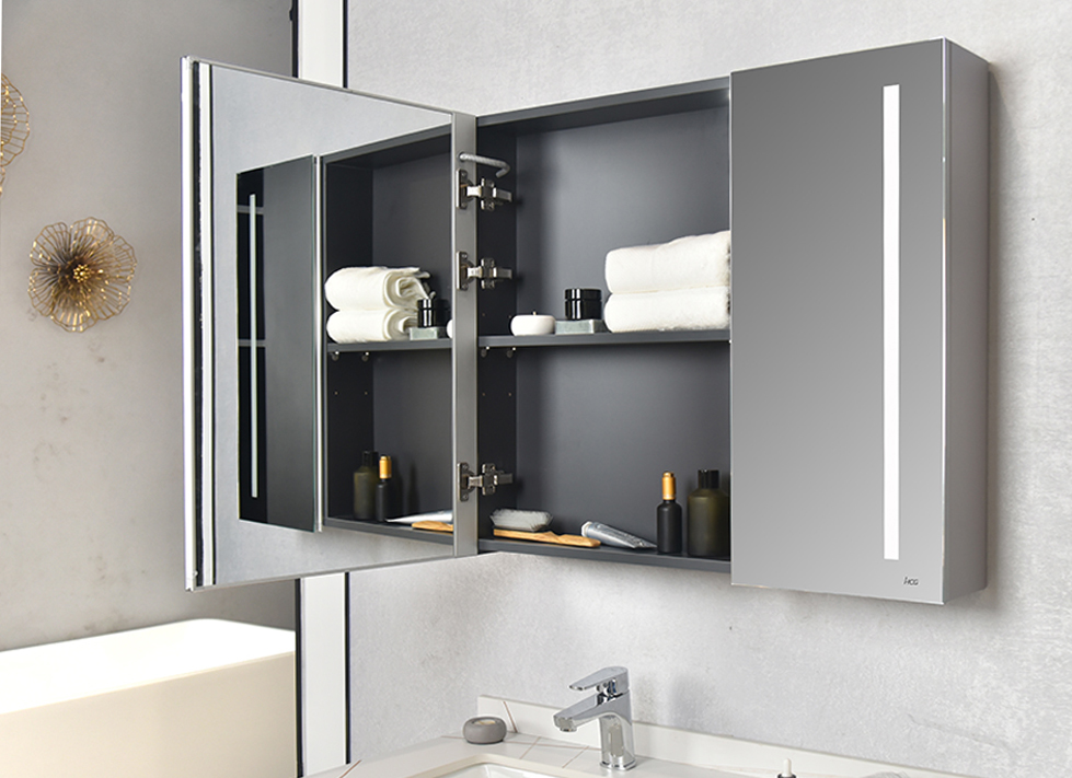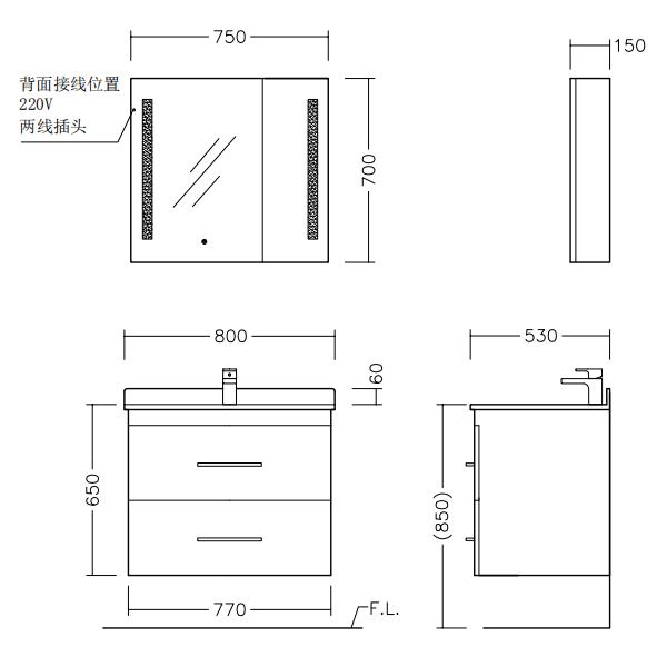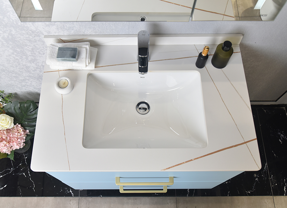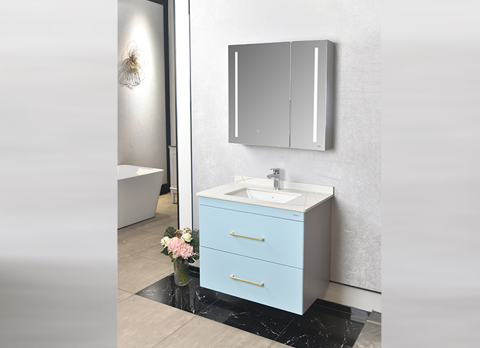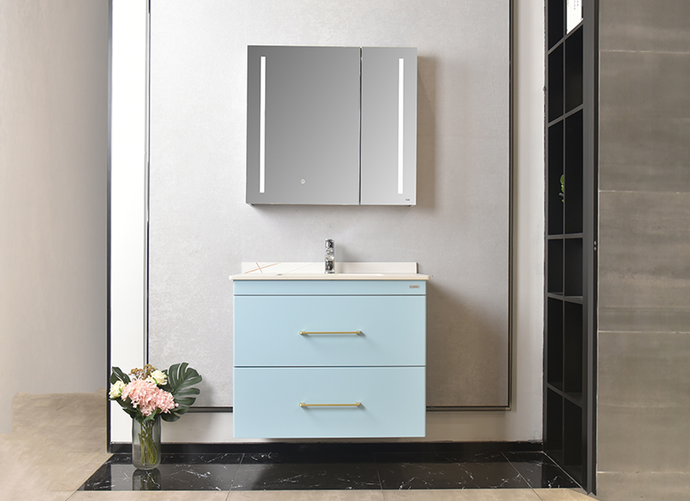 ● 现代简约风格,浴室柜组整体采用多层实木板,主要外观面为亚光漆面; ● 柜体为大容量双抽屉设计,门板和侧板分别为浅蓝色和浅紫色亚光漆; ● 台面为劳伦金岩板,搭配台下盆; ● 镜柜为双开门设计,门框采用铝合金边框,双面均附有镜面,并具有除雾和LED照明灯;